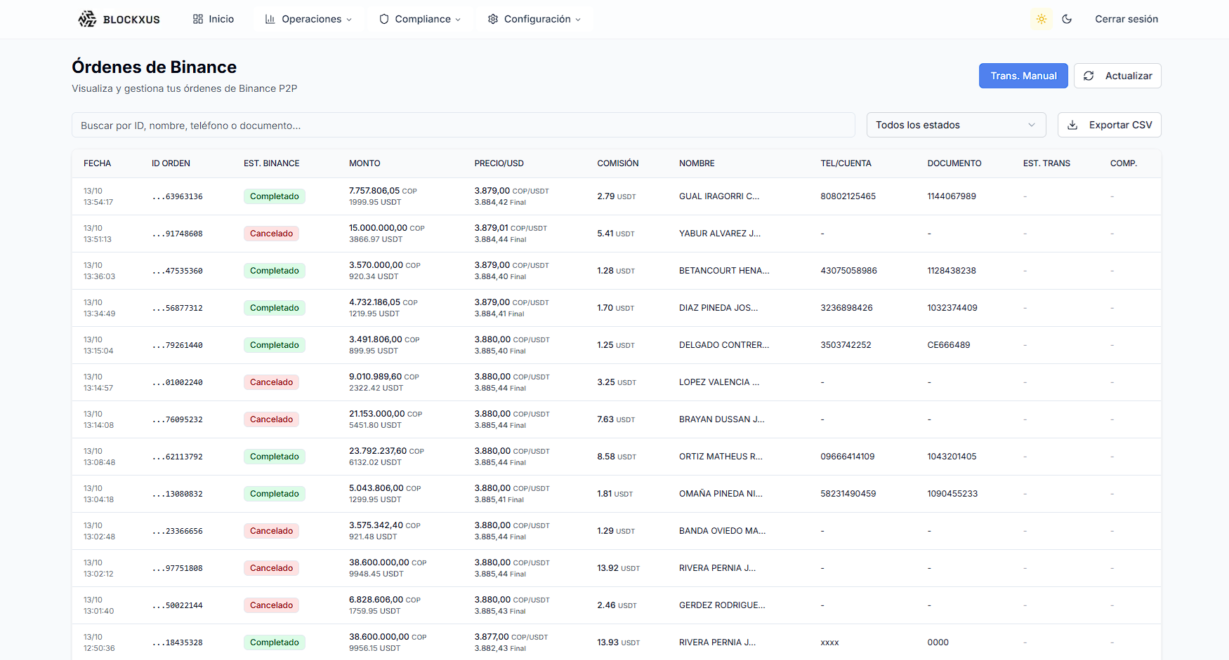 Dashboard completo con métricas de transacciones, compliance y analytics para toma de decisiones.